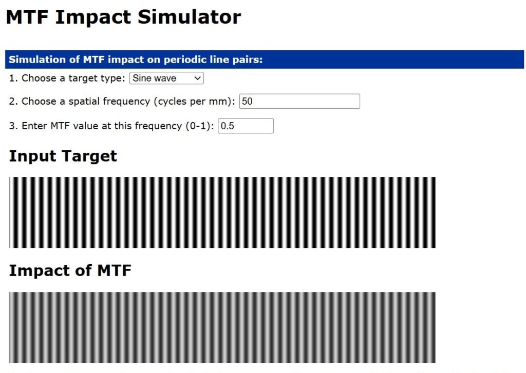 The simulator shows a perfect input target and a corresponding image impacted by your selected MTF value, helping you visualize how contrast loss affects clarity.