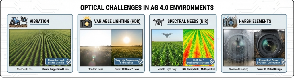 Smart agriculture increasingly depends on imaging systems to automate field monitoring, detect crop stress, identify pests, guide autonomous equipment, and generate precision analytics. The optical requirements span an unusually wide range: from wide-area drone survey lenses to close-range multispectral sensors, from RGB day cameras to NIR-enabled night inspection systems. No single off-the-shelf lens handles all of these applications — and agricultural field conditions are harsh.