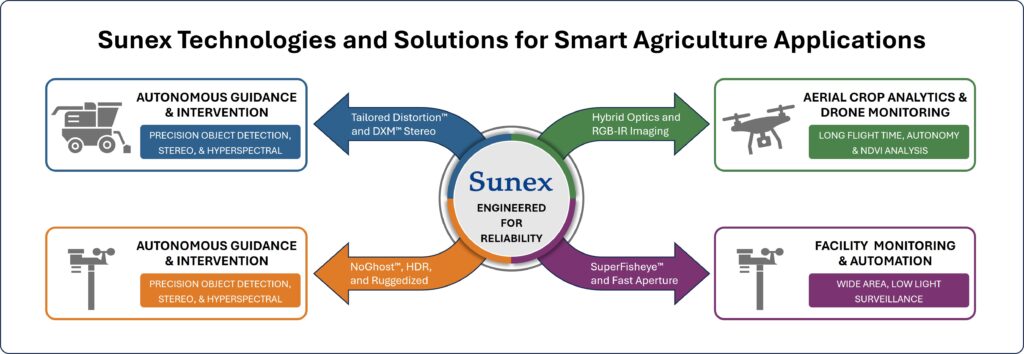 Sunex supports Smart Agriculture imaging across this full spectrum of applications through precision optics, robust wide-field designs, and advanced technologies such as DXM™ single-sensor stereo imaging. By enabling reliable depth perception, repeatable geometry, and production-ready camera modules, Sunex helps customers translate imaging performance into operational reliability, scalable deployment, and measurable yield improvement.